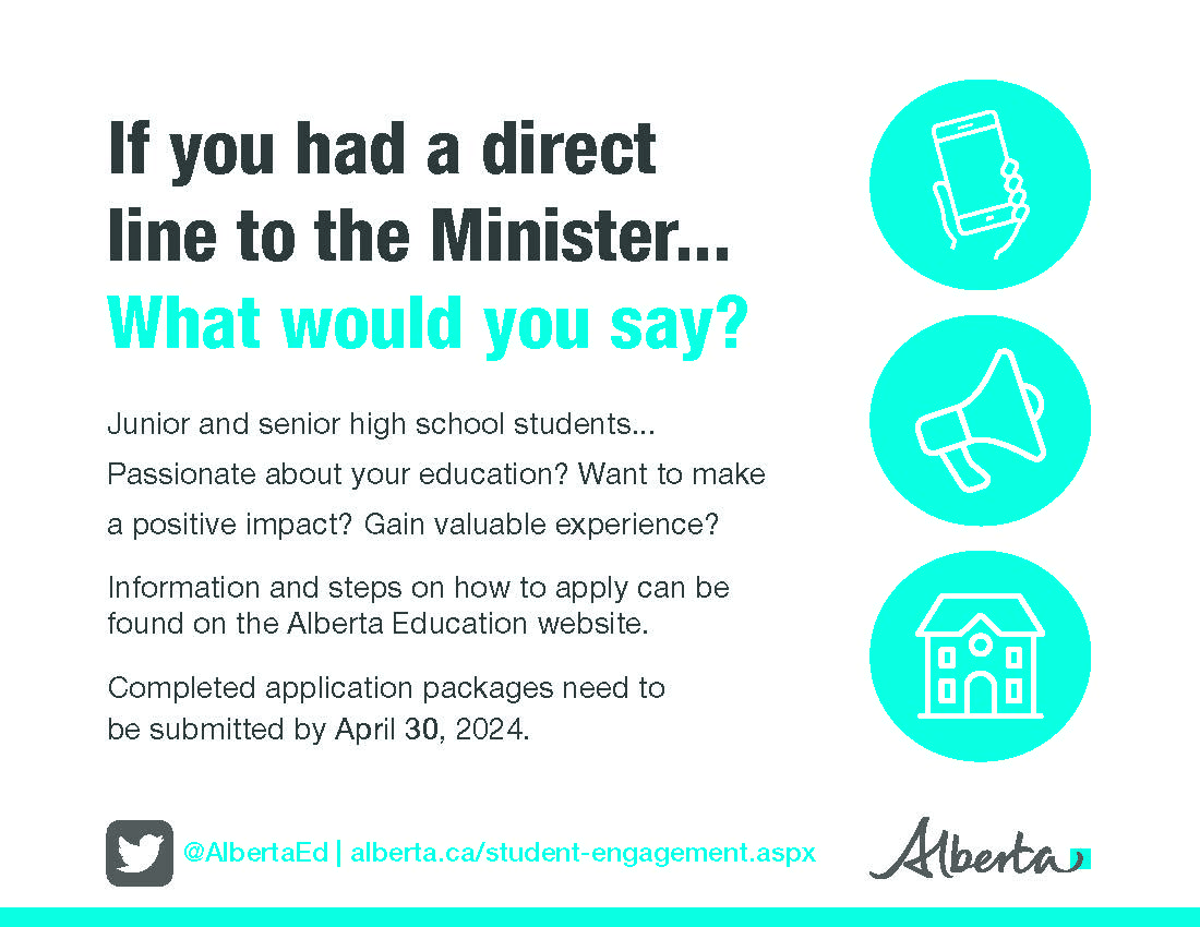 Calling all Black Gold junior and senior high students! Alberta Education is seeking approximately 40 junior and senior high school students from across Alberta, between the ages of 14 and 19, representing diverse interests, identities, backgrounds, and perspectives, to join the 2024-25 Minister’s Youth Council.